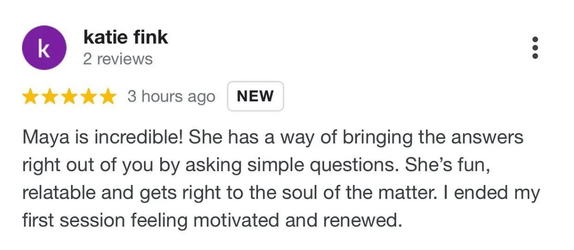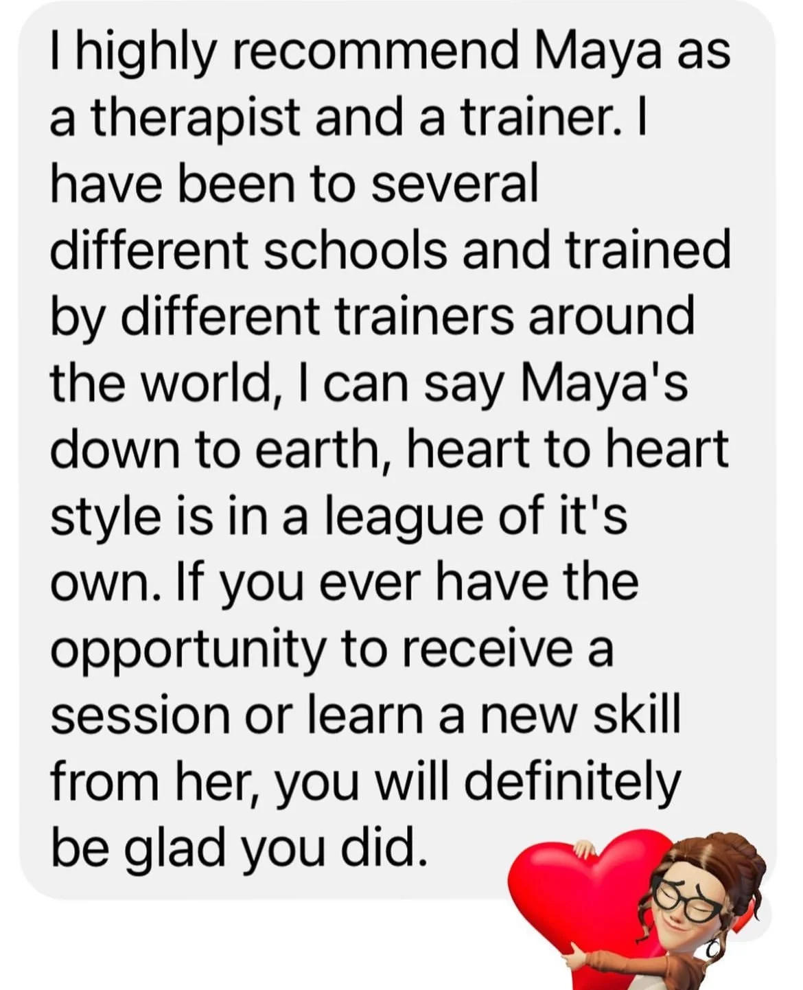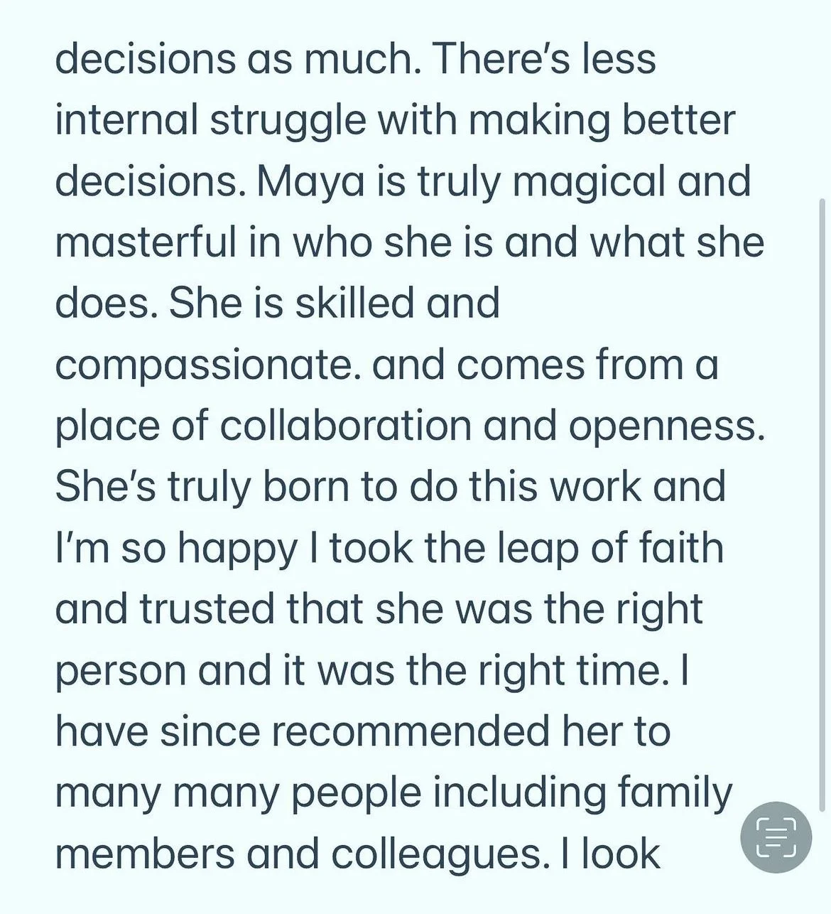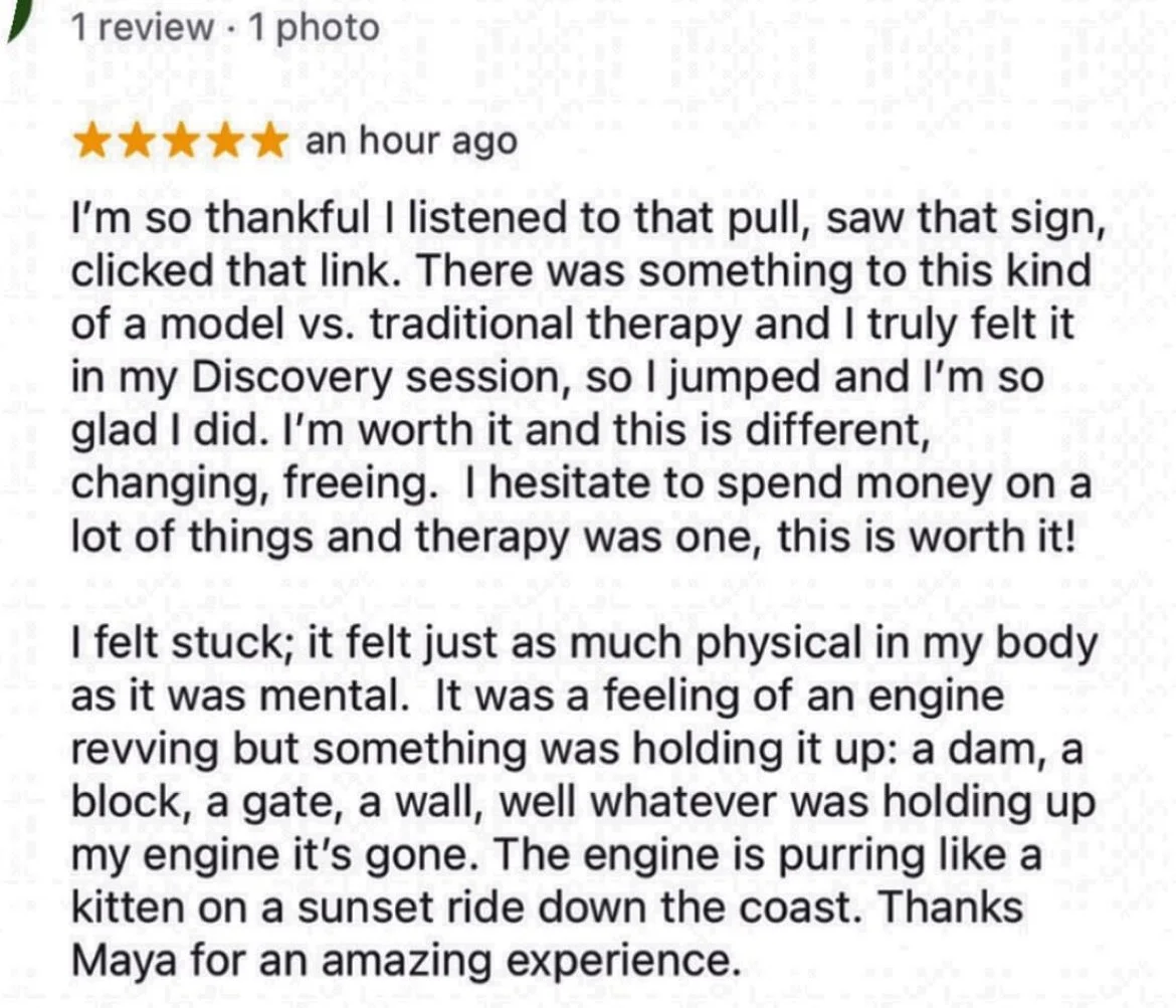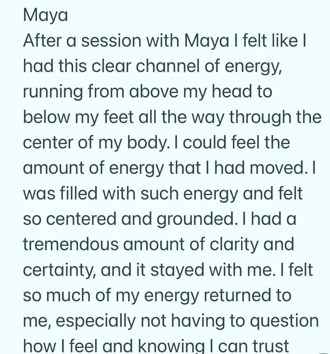 Maya is easy to connect with and guides you through her sessions while feeling supported through the process. I can’t say enough how much I recommend her services.