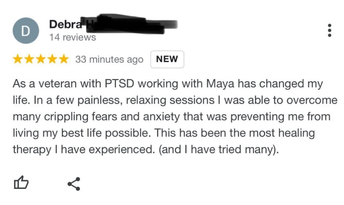 Debra Huchinson, NM 2022As a veteran with PTSD working with Maya has changed my life. In a few painless, relaxing sessions I was able to overcome many crippling fears and anxiety that was preventing me from living my best life possible. This has been the most healing therapy I have experienced (and I have tried many).