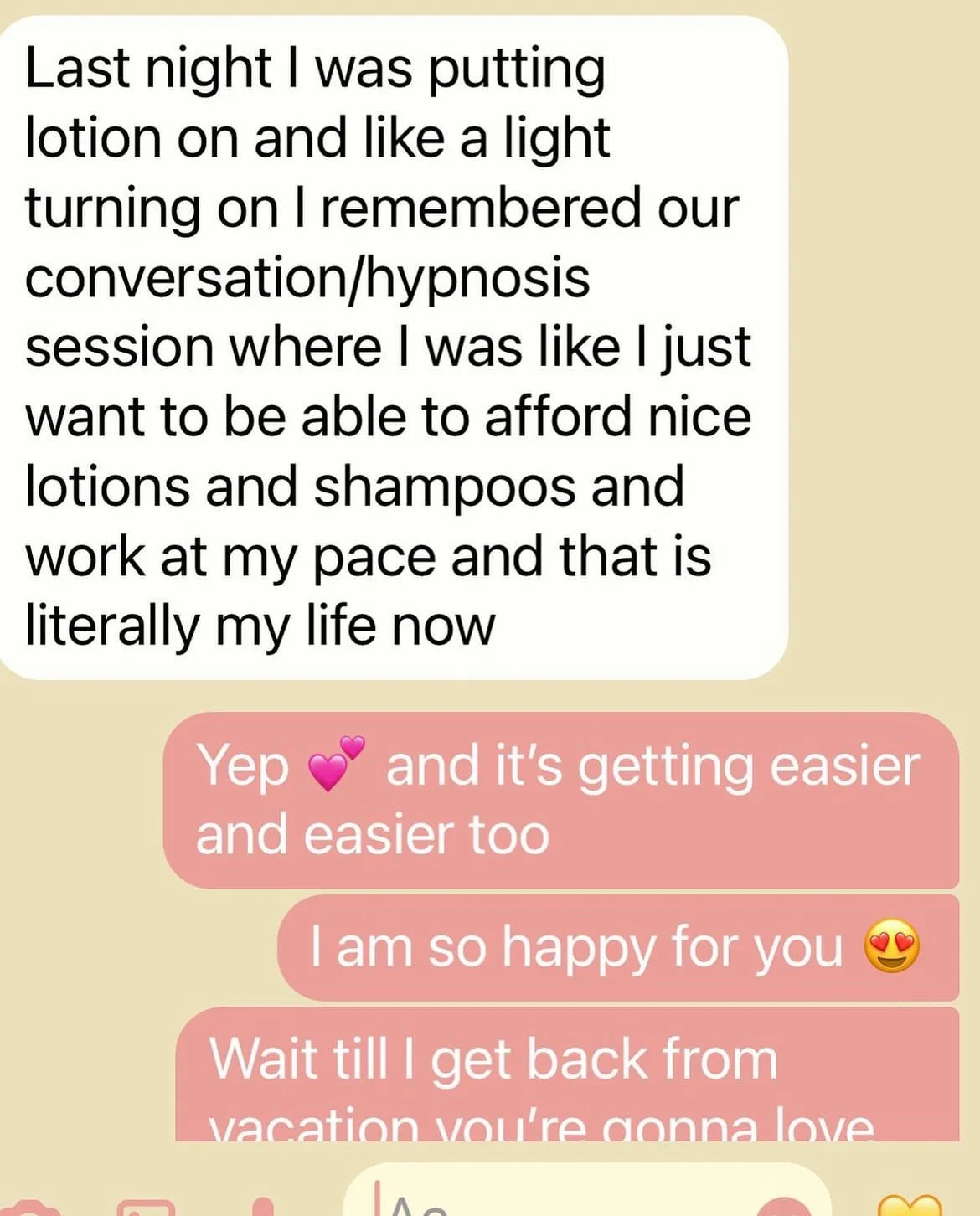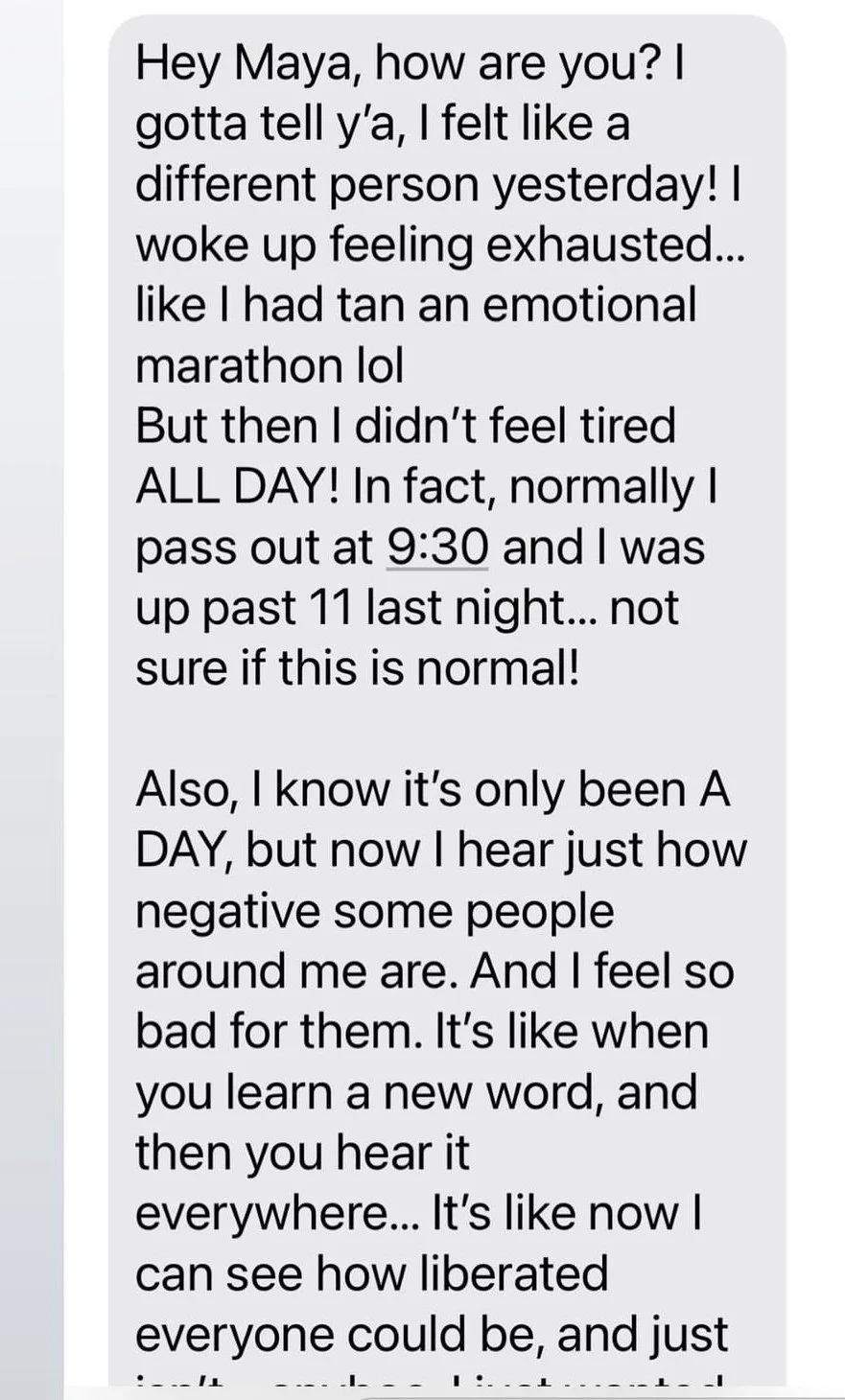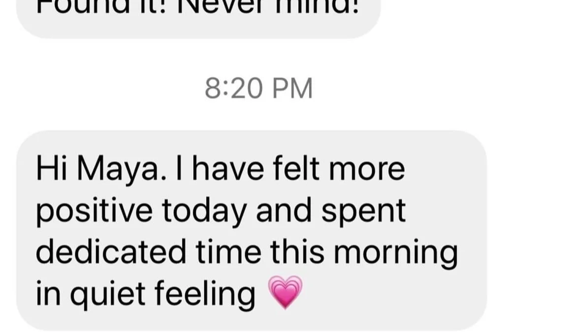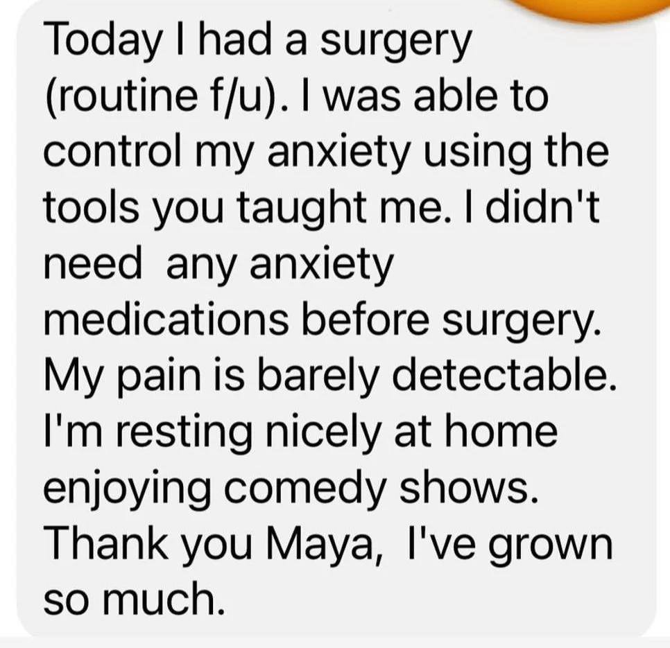 Janet Toner, March 2022I’m just letting you know that since hypnosis I feel really different. Yesterday I was feeling uncomfortable- it was tough a bit. But today, I am still feeling discomfort— but really at peace— it’s weird!! I love it!! And I don’t see things the same— it’s like my consciousness expanded. Thank you so much Maya !!!