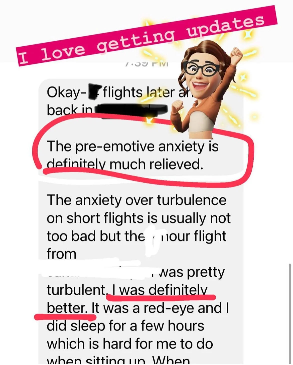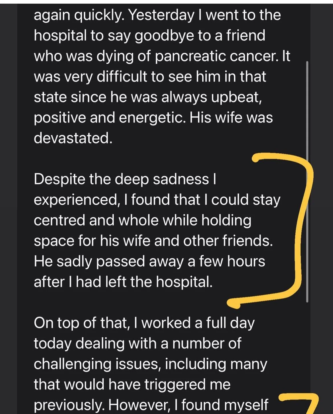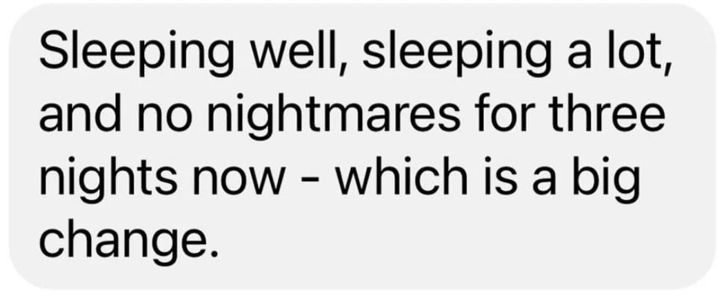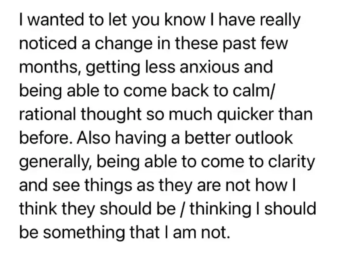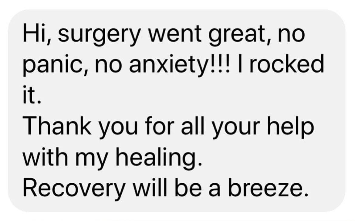 Janet Toner, March 2022I’m just letting you know that since hypnosis I feel really different. Yesterday I was feeling uncomfortable- it was tough a bit. But today, I am still feeling discomfort— but really at peace— it’s weird!! I love it!! And I don’t see things the same— it’s like my consciousness expanded. Thank you so much Maya !!!