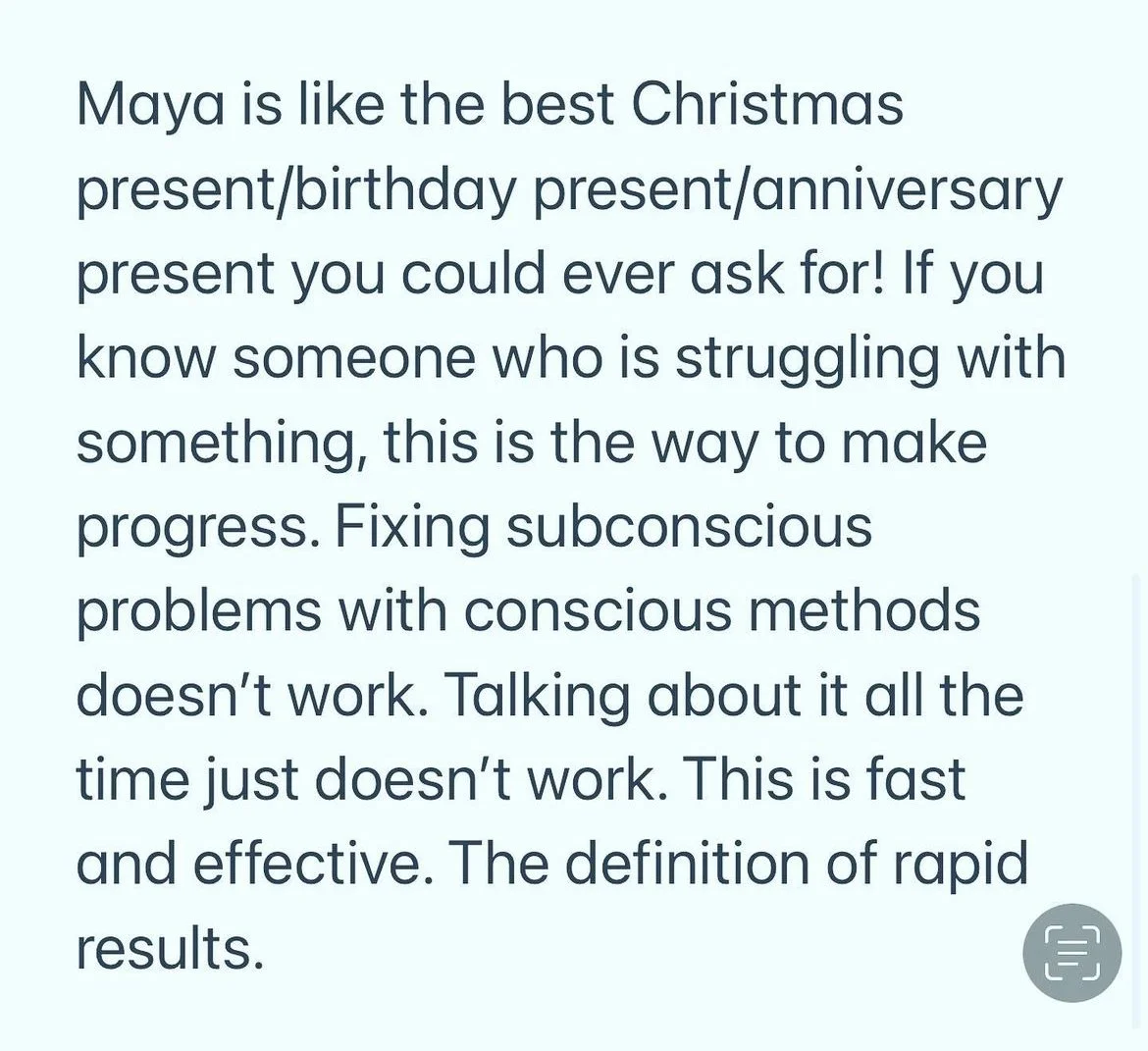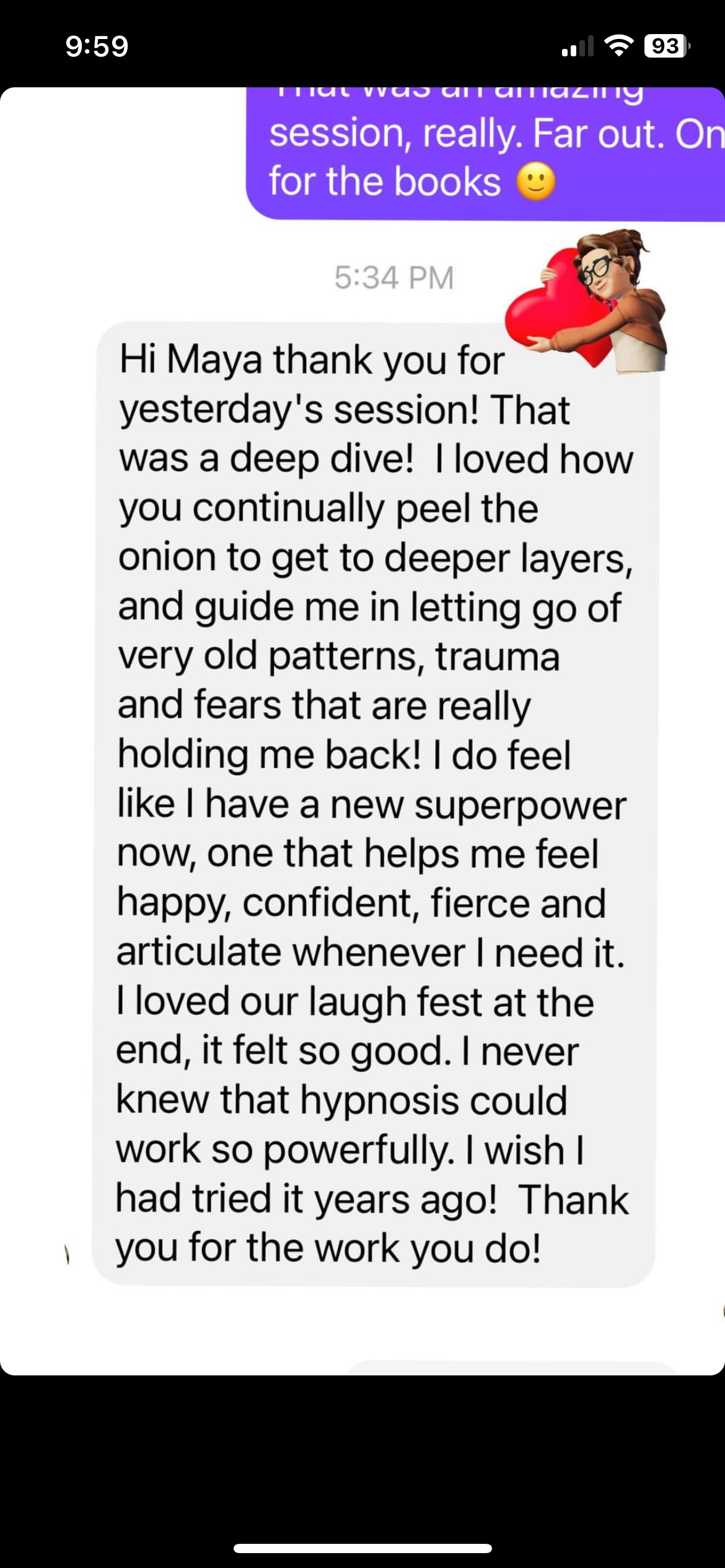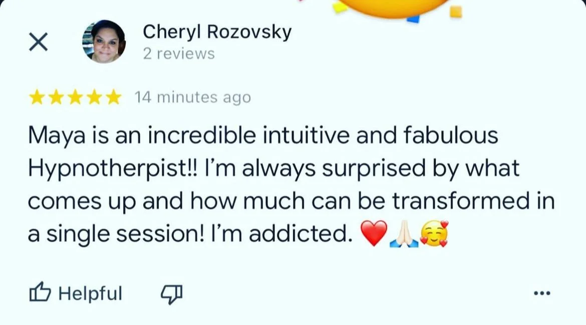 Maya is an incredible intuitive and fabulous Hypnotherpist!! I’m always surprised by what comes up and how much can be transformed in a single session! I’m addicted. ❤️🙏🏻🥰
