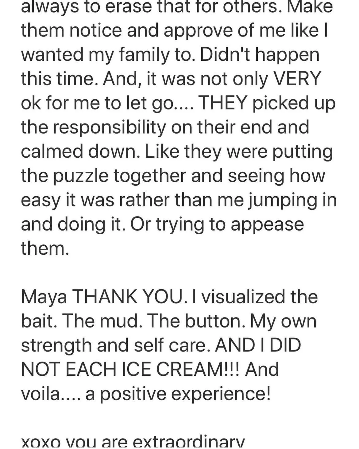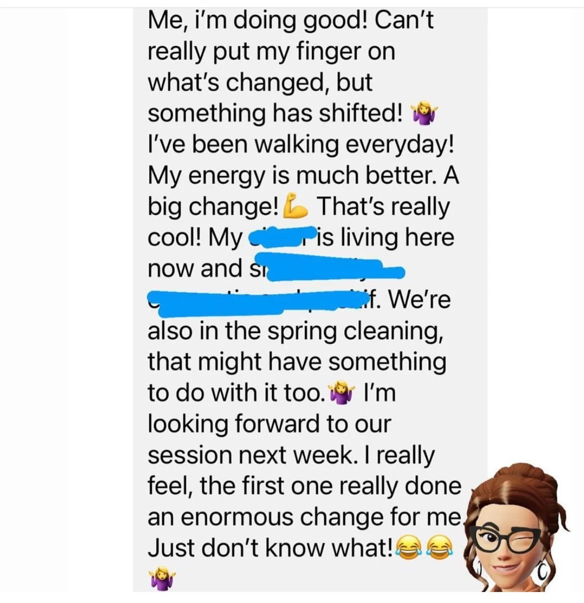 Another one! It is really magical 🧚to me to see how shifts can happen so spontaneously, as soon as my mind realizes what my heart wants!💜 These sessions with Maya are life changing. 🌈I know that my life now can’t be anything less then better and better. Once you know, you know. Off coarse there are tears and hard spots to clear. That’s the magic……the clearing. 🙏💜 Thank you Maya!❤️😘