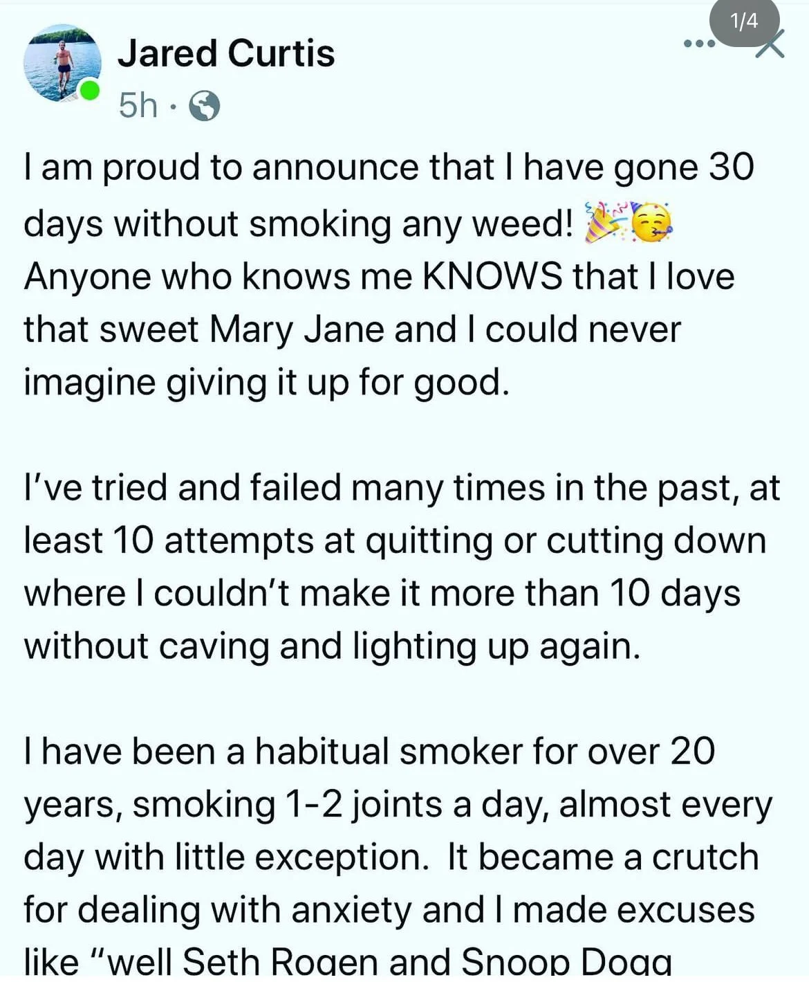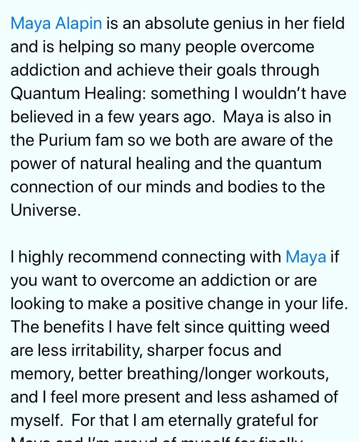 Jared Curtis, Montreal, Canada, 2022I am proud to announce that I have gone months without smoking any weed!Anyone who knows me KNOWS that I love that sweet Mary Jane and I could never imagine giving it up for good.I’ve tried and failed many times in the past, at least 10 attempts at quitting or cutting down where I couldn’t make it more than 10 days without caving and lighting up again.I have been a habitual smoker for over 20 years, smoking 1-2 joints a day, almost every day with little exception. It became a crutch for dealing with anxiety and I made excuses like “well Seth Rogen and Snoop Dogg smoke weed all the time and they’re successful!” I know that it has benefits but I also knew combusting weed in rolled joints was not good for my health and needed to do something. It also affected my wife negatively and I didn't want to be an enabler to her anymore.Then luckily, about a month ago, a contact on Facebook who I never actually met before commented on a post of mine where I expressed wanting to get rid of this addiction and she suggested hypnotherapy.I am so blessed that Maya reached out, and suggested her hypnosis practice as a possibility.While under hypnosis over Zoom, she very gently suggested mental techniques that immediately took effect in my subconscious. I didn’t feel any different right after our first session, but whatever she did definitely worked! I’ve had a bag of weed just sitting in my closet, untouched for the past 30 days and I have no desire to smoke whatsoever!What I thought to be impossible was overcome at a subconscious level, and I no longer crave or miss smoking weed; I'm still in disbelief that it actually worked so quickly. Maya is an absolute genius in her field and is helping so many people overcome addiction and achieve their goals through Quantum Healing: something I wouldn’t have believed in a few years ago. I highly recommend connecting with Maya if you want to overcome an addiction or are looking to make a positive change in your life.The benefits I have felt since quitting weed are less irritability, sharper focus and memory, better breathing/longer workouts, and I feel more present and less ashamed of myself. For that I am eternally grateful for Maya and I’m proud of myself for finally giving up this vice for good I am continuing the hypnosis sessions even though I feel strongly that I have overcome the addiction, because I want to further unlock any hidden potential I have for growth and change.