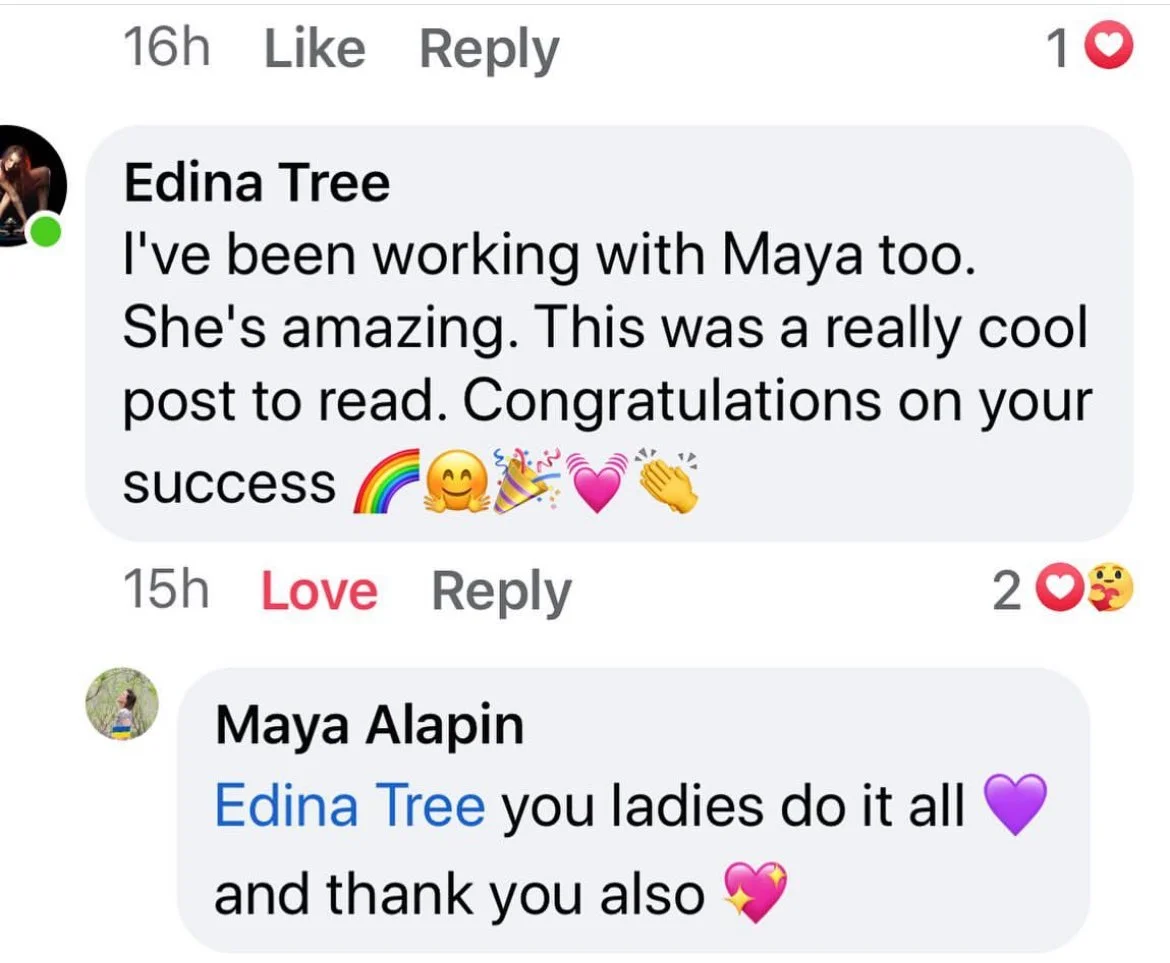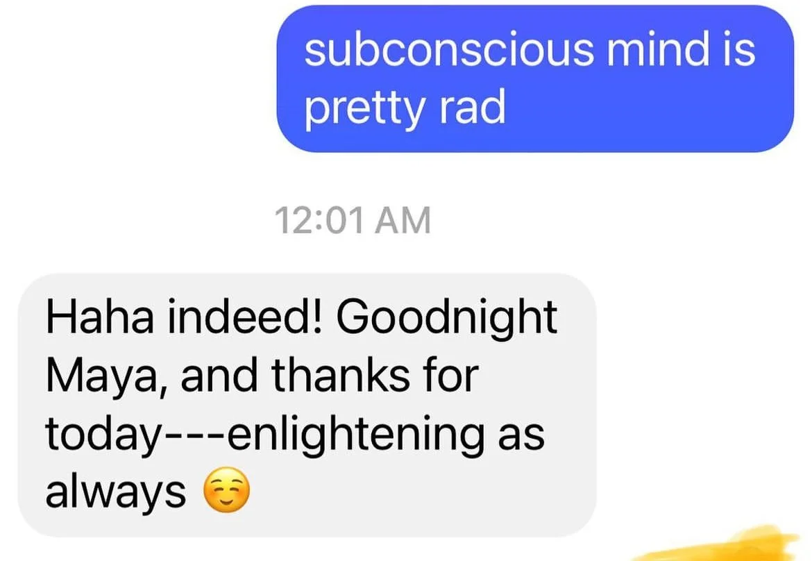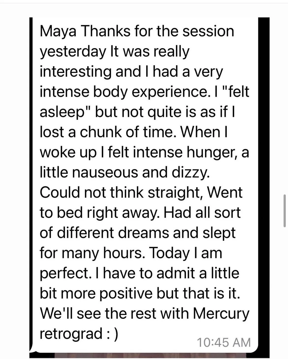 Edina Hamilton, 2022“I love working with Maya. She's very down to earth which makes is easy for me to relax and be myself. I love how she breaks down each exercise in a simple way that is easy to understand. If this is your first time delving deep into the subconscious, Maya is a great start because she explains it in a simplified way that makes sense and isn't overwhelming.I was processing trauma during one of my sessions and that night I had a dream of myself releasing that memory. I love how simple this process is! Just relax, give in, go with the flow and let your mind take you. Maya facilitates really fun and interesting exercises!”