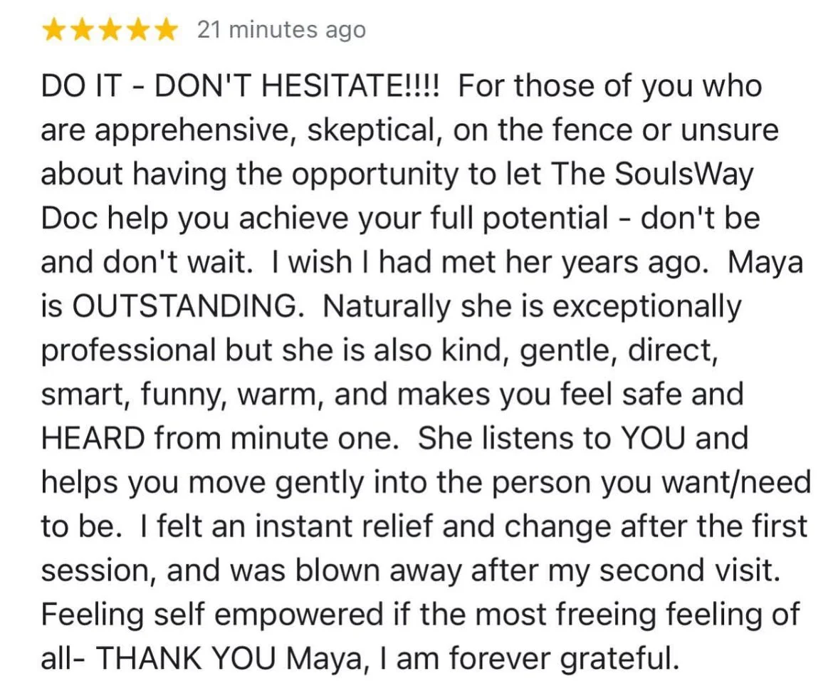 If you find yourself struggling with similar challenges, I encourage you to take that first step toward a brighter future by seeking the assistance of Maya. I am eternally grateful for her expertise and unwavering support throughout my session, and I am confident that she will have a positive and transformative impact on your life as well.