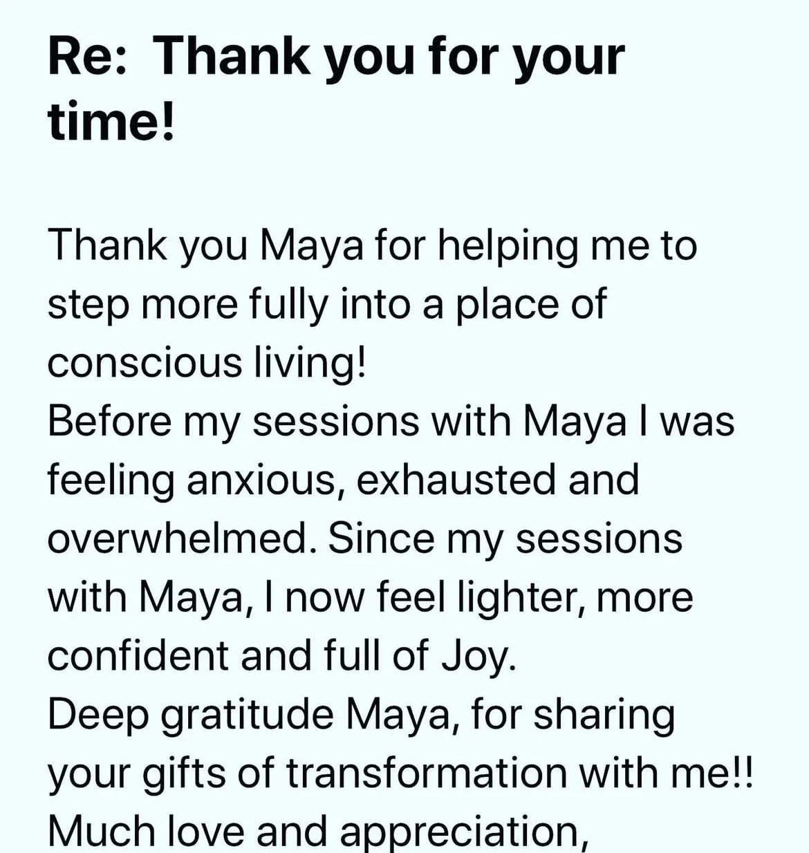 CR, Montreal, CanadaThank you Maya for helping me to step more fully into a place of conscious living!Before my sessions with Maya I was feeling anxious, exhausted and overwhelmed. Since my sessions with Maya, I now feel lighter, more confident and full of Joy.Deep gratitude Maya, for sharing your gifts of transformation with me!!Much love and appreciation