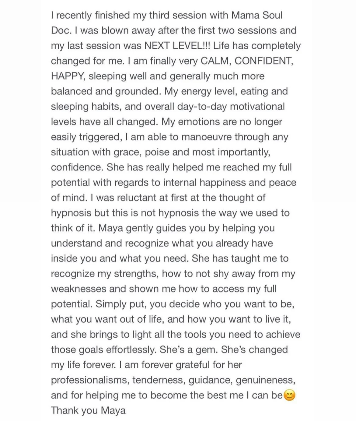 I recently finished my third session with Mama Soul Doc. I was blown away after the first two sessions and my last session was NEXT LEVEL!!! Life has completely changed for me. I am finally very CALM, CONFIDENT, HAPPY, sleeping well and generally much more balanced and grounded. My energy level, eating and sleeping habits, and overall day-to-day motivational levels have all changed. My emotions are no longer easily triggered, I am able to manoeuvre through any situation with grace, poise and most importantly, confidence. She has really helped me reached my full potential with regards to internal happiness and peace of mind. I was reluctant at first at the thought of hypnosis but this is not hypnosis the way we used to think of it. Maya gently guides you by helping you understand and recognize what you already have inside you and what you need. She has taught me to recognize my strengths, how to not shy away from my weaknesses and shown me how to access my full potential. Simply put, you decide who you want to be, what you want out of life, and how you want to live it, and she brings to light all the tools you need to achieve those goals effortlessly. She’s a gem. She’s changed my life forever. I am forever grateful for her professionalisms, tenderness, guidance, genuineness, and for helping me to become the best me I can be 😊 Thank you Maya